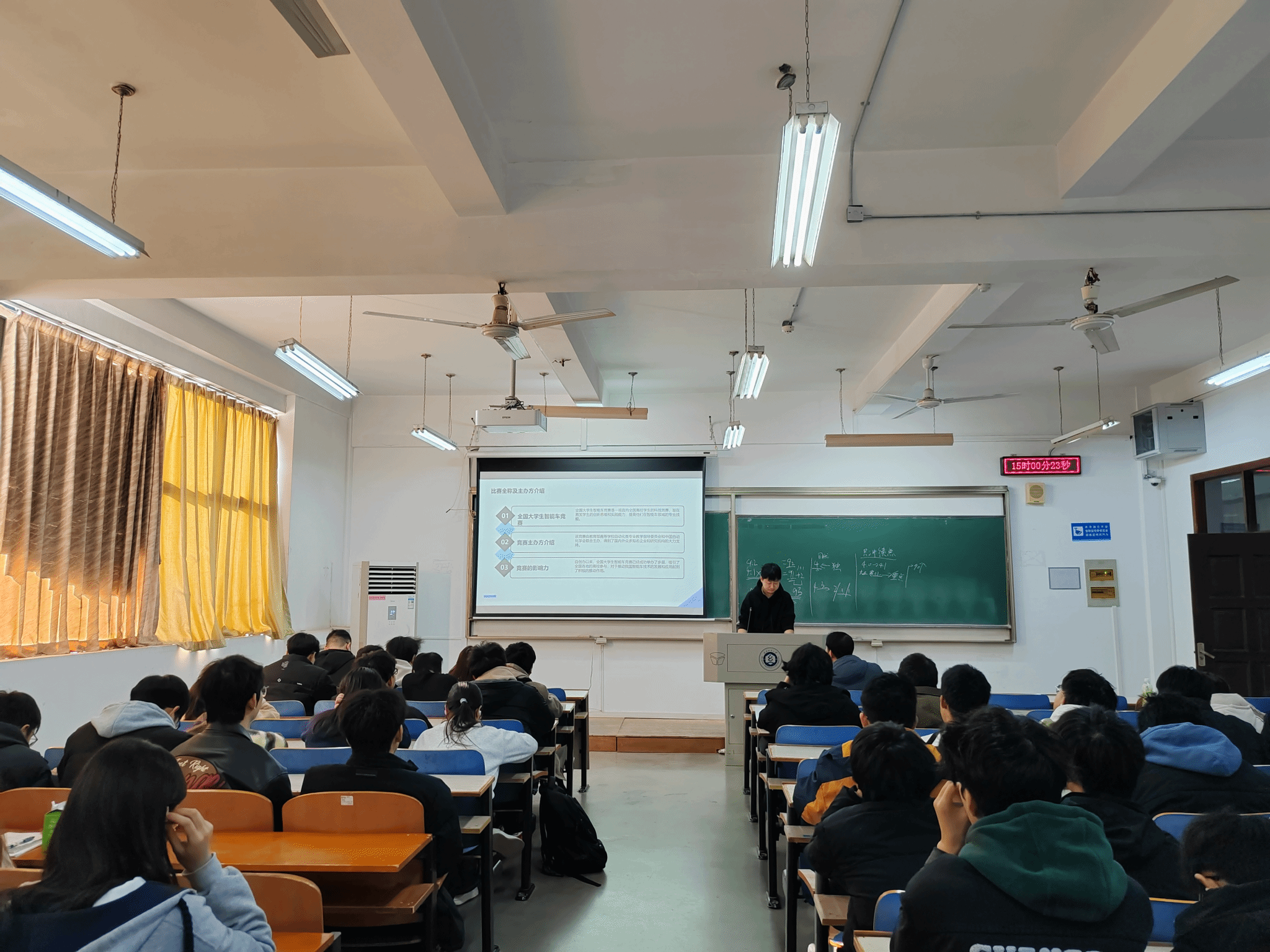 汇报中,叶盛廷首先阐释了学科竞赛的核心内涵与双重属性,强调其在锻炼智力、拓展知识边界上的重要作用,并详细介绍了教育部认可的各类竞赛项目及电子类、智能车竞赛的学习路径与能力要求,为同学们提供了清晰的参赛指引。陈绍鹏则聚焦全国大学生智能车竞赛,从竞赛概述、团队组建、实战经验及常见挑战应对等方面展开分享,重点讲解了团队成员技能互补、有效沟通协作的重要性,以及创新思维和坚持不懈在备赛中的关键作用。刘鑫结合自身参赛经历,补充了竞赛准备过程中的实用技巧,让分享内容更具实操性。