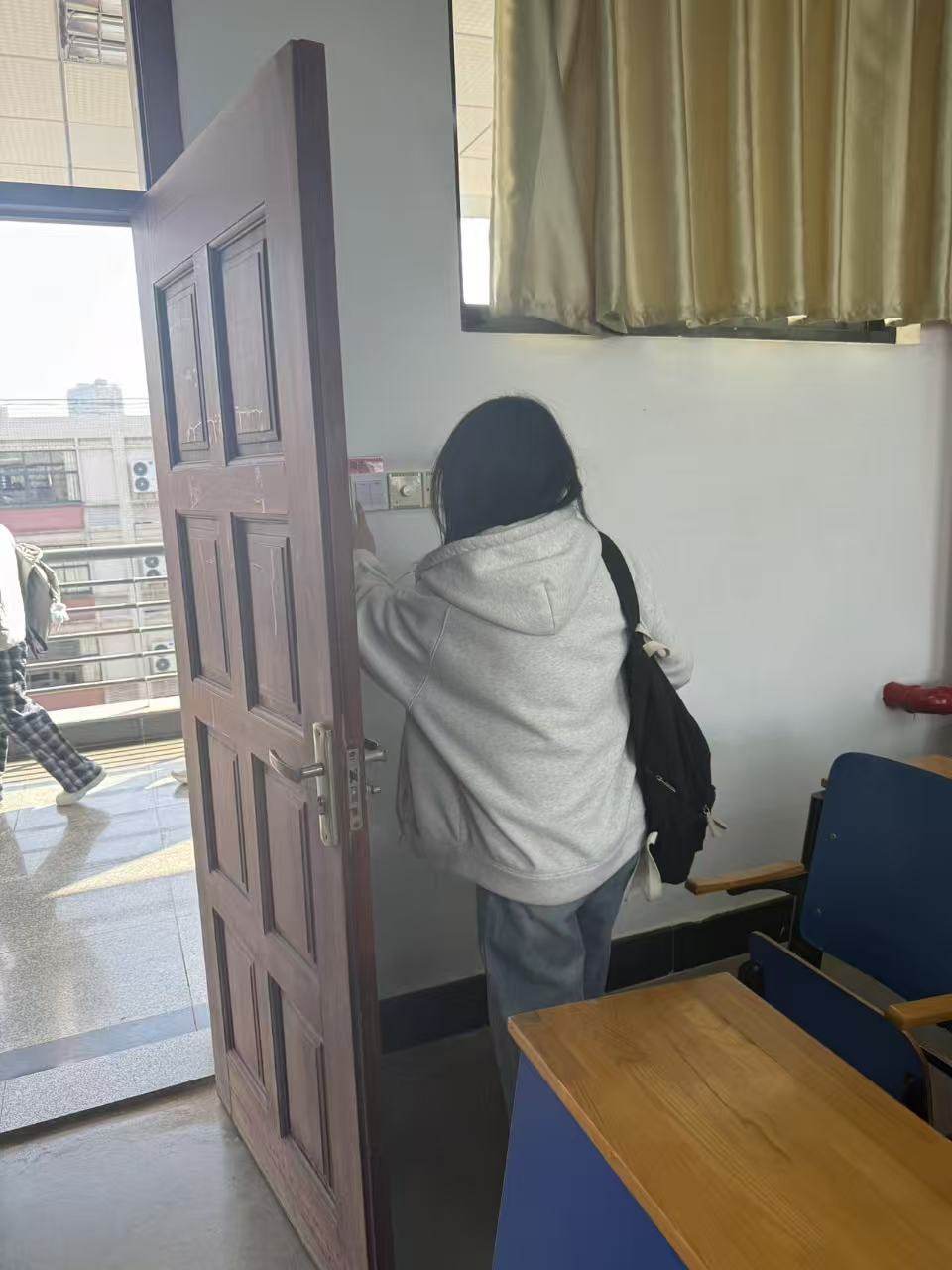 志愿者开展教学楼夜间用电专项清查行动。活动中,志愿者分组对各楼层教室进行逐间排查,重点检查照明、空调、多媒体等设备是否存在 “人走未关” 现象,对发现的未断电设备,志愿者逐一关停,以沉浸式实践向广大师生传递了 “节约用电、绿色校园” 的环保理念。